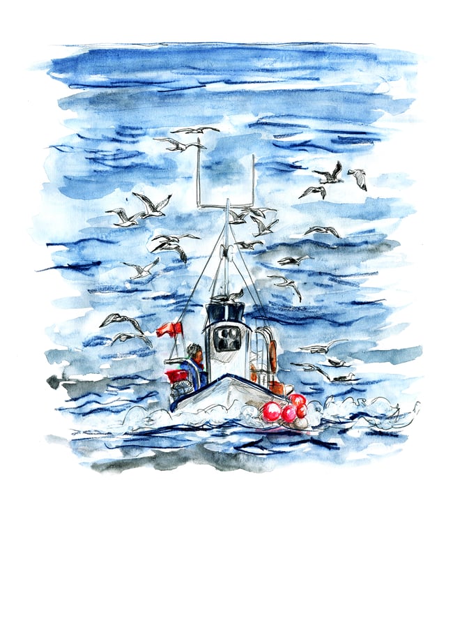 Fishing boat coming in across the sea with hungry optimistic gulls.