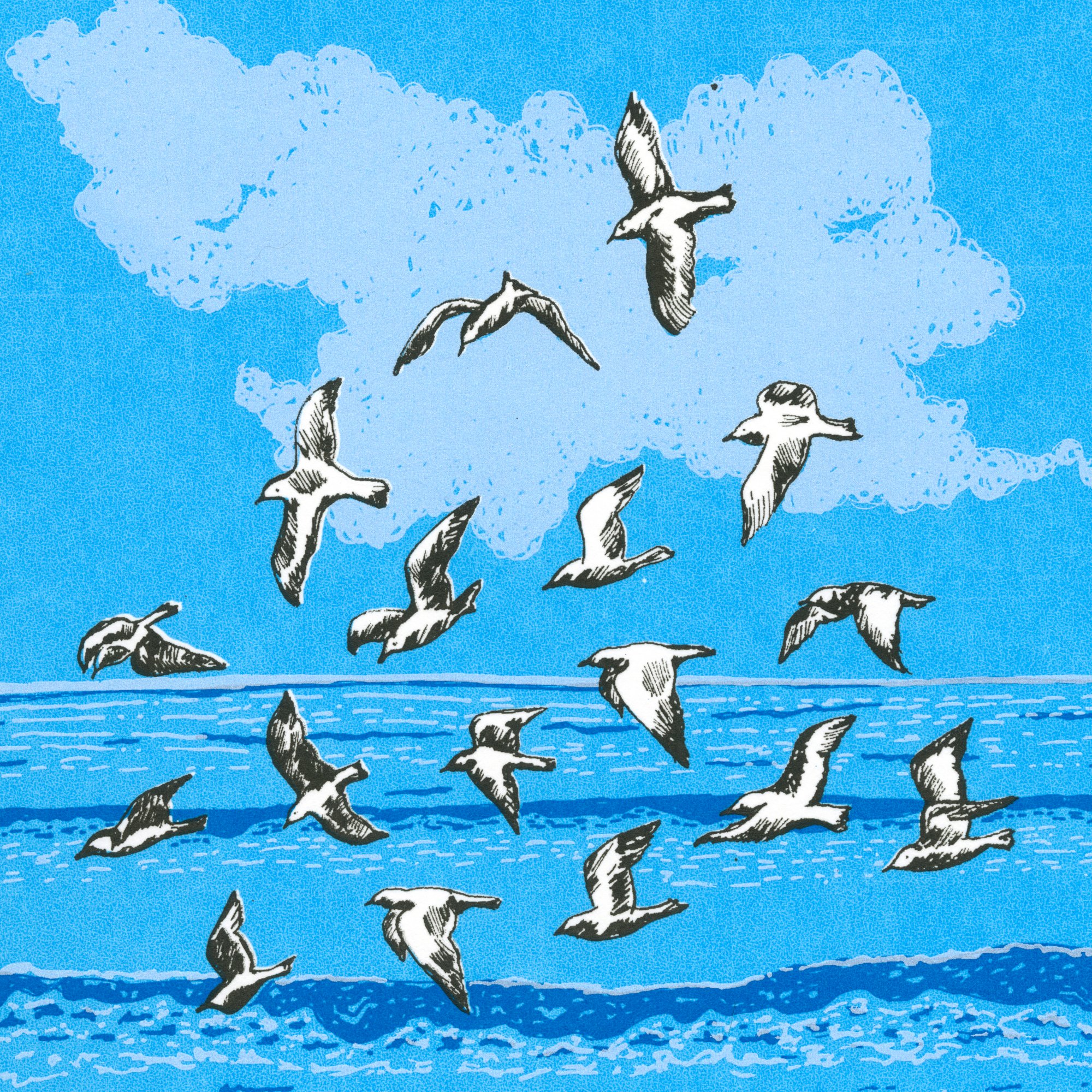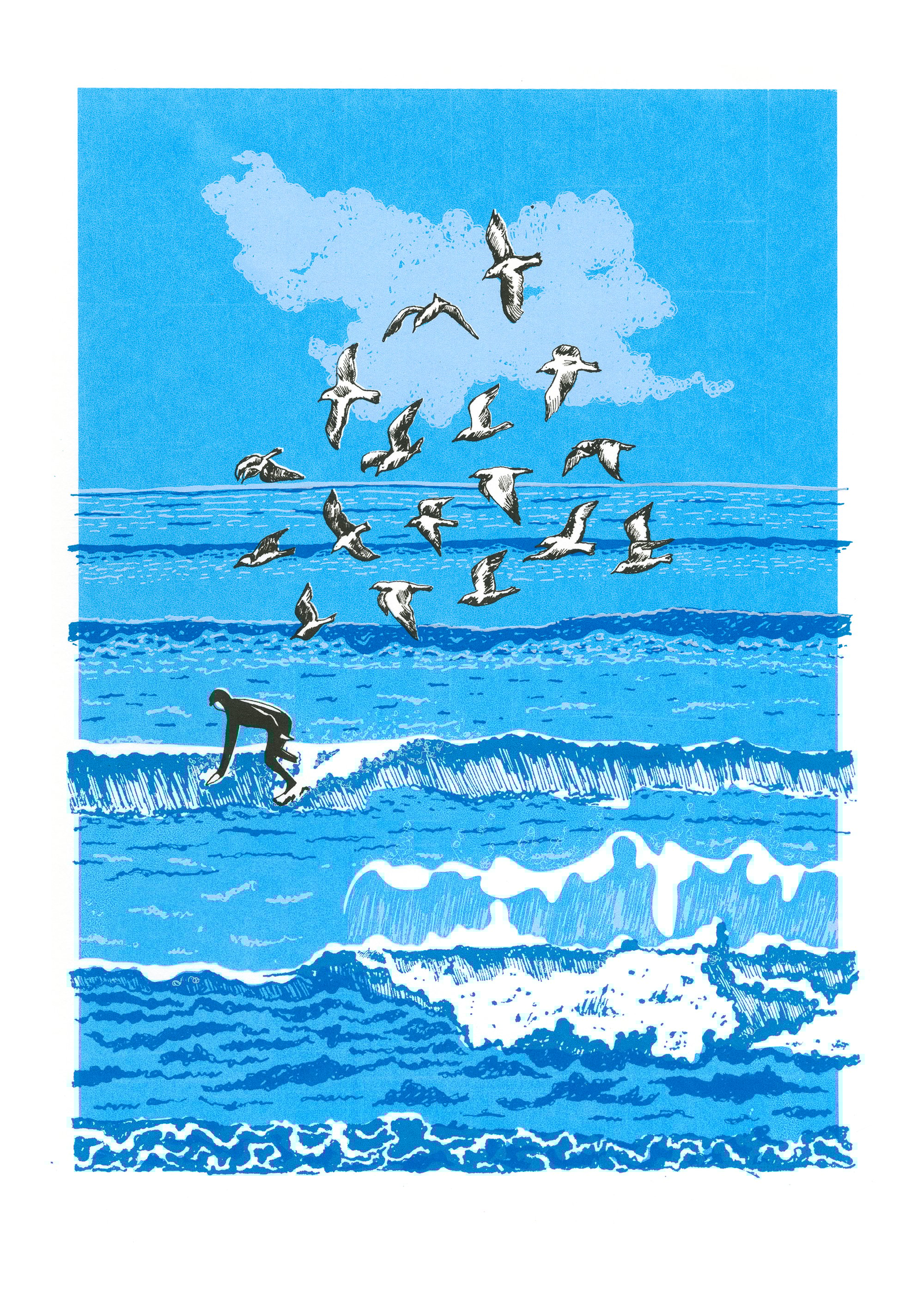 For me, surfing is a release and a pleasure. In my prints the birds symbolise cares flying and way and my positivity soaring through being in the sea, hanging out with the natural world and catching a wave.