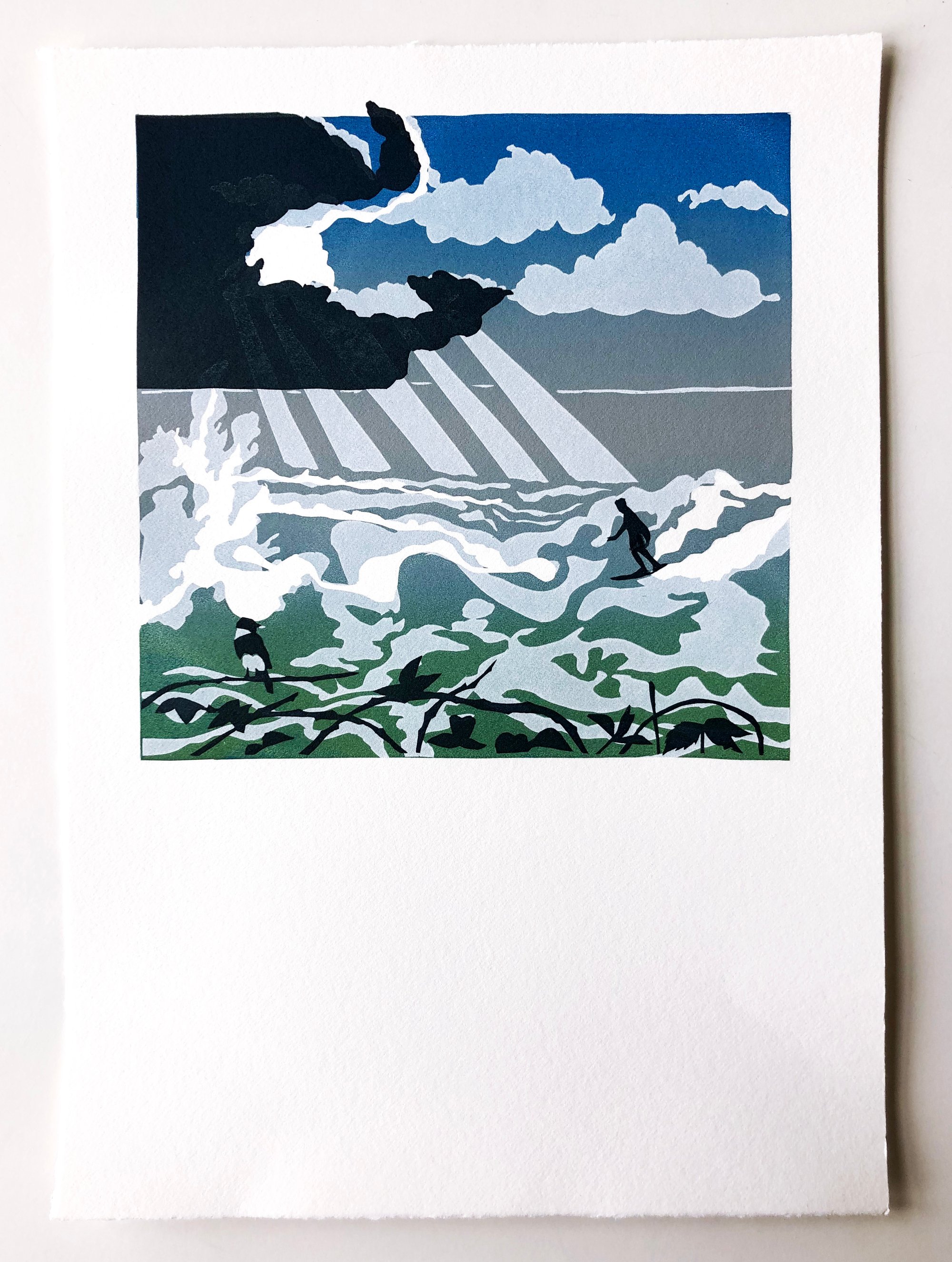 The seventh in my series of stencil Wave Project screen prints, surfing a brilliant wave with a bird watching on and the Spring sunlight making its way through the clouds for you. For everyone who’s surfing memories keep them smiling! Surfing and the sea are the best mood changes.