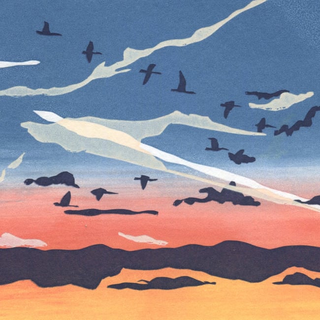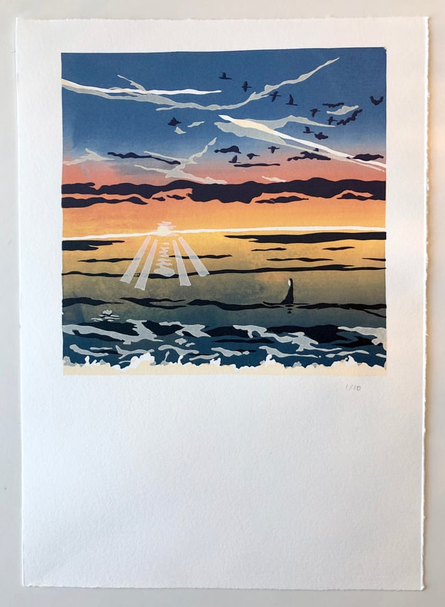 The ninth in my series of stencil Wave Project screen prints, I have been surfing twice when a seal has joined me in the water, so this one has a little seal on the left enjoying the sunset and the autumn geese along with the surfer. For everyone who’s surfing memories keep them smiling! Surfing and the sea are the best mood changes.