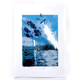 Wave Project Contemplation print - surfer watching big waves with seagulls flying in stormy sky